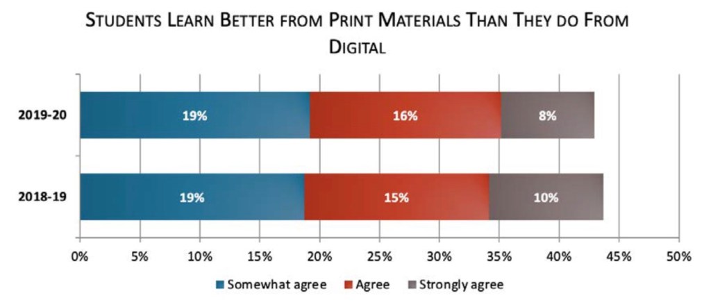 Another interesting finding of the US study is that perception of the value of digital materials in 2020 mirror results from the previous report, with only very slight changes. While there was considerable use of digital materials throughout 2020, it appears this has not resulted in an improvement (or decline) in faculty opinions about their effectiveness, as shown in the figure below.