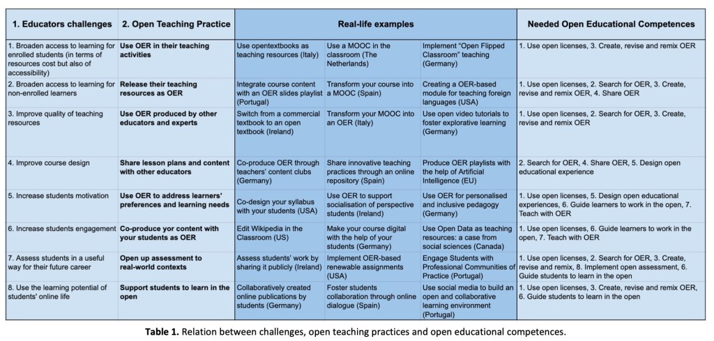 This Open Game builds on a Handbook of Successful Open Teaching Practices published in 2020 by members of the project team. As illustrated in the above table, the Handbook presents 24 real-life open teaching practices that respond to eight main challenges educators face which can be tackled through open approaches. For each of these challenges, three open teaching practices are described, with commentary on their potential for transferability and the competences needed to put them in place in other educational settings.