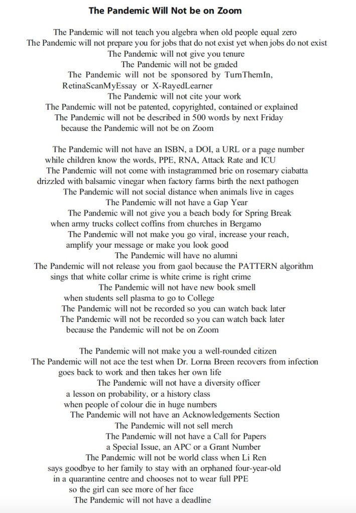 Peters, M. et, al. (2020) Reimagining the new pedagogical possibilities for universities post-Covid-19. Educational Philosophy and Theory. Available at https://doi.org/10.1080/00131857.2020.1777655