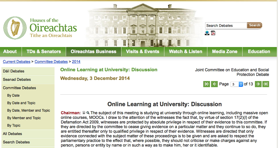 At very short notice, last Wednesday, Professor Brian MacCraith, President of Dublin City University, and Professor Mark Brown, Director of the National Institute for Digital Learning, along with representatives from the UK Open University and Trinity College Dublin, were invited to give a brief presentation to the Joint Committee on Education and Social Protection. A transcript of these presentations appears on the Committee’s website under the discussion topic of ‘Online Learning at University‘. The presentations and follow up discussion was also streamed live and a recording should be available in the next few weeks.