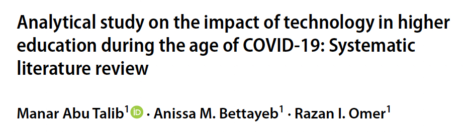 Talib. A. M., Bettayeb, A., & Omer, R. (2022). Analytical study on the impact of technology in higher education during the age of COVID-19: Systematic literature review. Education and Information Technologies, 26, 6719–6746.https://doi.org/10.1007/s10639-021-10507-1