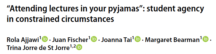 Ajjawi, R., Fischer, J., Tai, J., Bearman, M., & Jorre de St Jorre, T. (2022). “Attending lectures in your pyjamas”: Student agency in constrained circumstances. Higher Educationhttps://doi.org/10.1007/s10734-022-00976-9