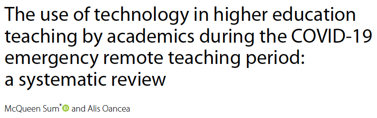 Sum, M., & Oancea, A. (2022). The use of technology in higher education teaching by academics during the COVID‑19 emergency remote teaching period: A systematic review. International Journal of Educational Technology in Higher Education, 19, 59. https://doi.org/10.1186/s41239-022-00364-4
