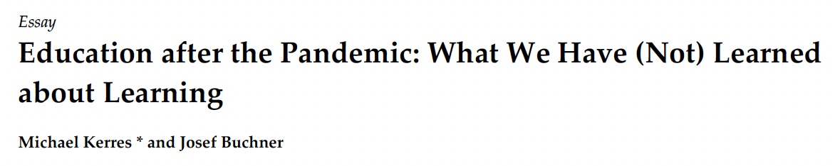 Kerres, M., & Buchner, J. (2022). Education after the pandemic: What we have (not) learned about learning. Education Sciences, 12, 315. https://doi.org/10.3390/educsci12050315