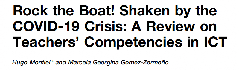 Montiel, H., & Gomez-Zermeño, M. G. (2022). Rock the boat! Shaken by the COVID-19 Crisis: A Review on Teachers’ Competencies in ICT. Frontiers in Education. 6:770442. https://doi.org/10.3389/feduc.2021.770442