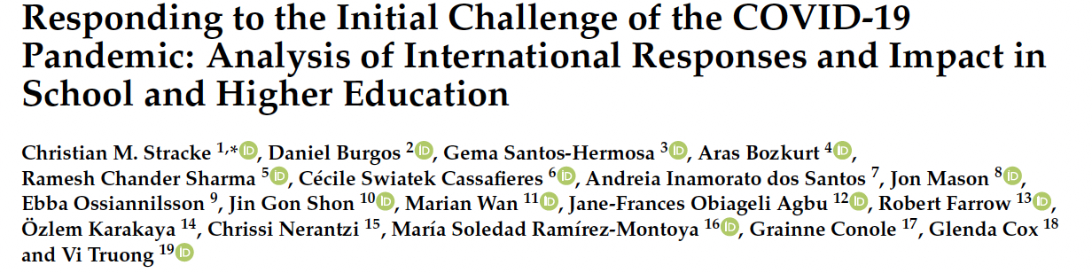 Stracke, C.M., Burgos, D., Santos-Hermosa, G., Bozkurt, A., Sharma, R.C., Swiatek Cassafieres, C., dos Santos, A.I., Mason, J., Ossiannilsson, E., Shon, J.G., et al. (2022).  Responding to the initial challenge of the COVID-19 pandemic: Analysis of international responses and impact in school and higher education. Sustainability 14(3), 1876. https://doi.org/10.3390/su14031876