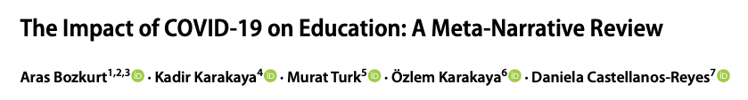 Bozkurt, A., Karakaya, K., Turk, M., Karakaya, O., & Castellanos‐Reyes, D. (2022).  The impact of COVID-19 on education: A meta-narrative review. TechTrends 66, 883–896. https://doi.org/10.1007/s11528-022-00759-0
