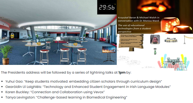 This format was adopted again for 2021 with the event run over three consecutive days. Our DCU colleague, Enda Donlon (2021), discusses the of myriad changes forced upon academic conferences during the Covid pandemic but lauds the creativity in formats and reimagined solutions that have ensued. One such format referenced by Donlon is “a combination of live-streamed presentations and pre-recorded content”, which was the approach taken for the 2020/2021 Teaching and Learning events.