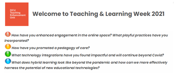 The Dublin City University (DCU) Teaching and Learning Week 2021 took place in early September. This event is run annually by the Teaching Enhancement Unit (TEU), traditionally over a single day, face-to-face. In 2020, Teaching and Learning Day became ‘Teaching and Learning Week’ with online events scheduled over a full week.