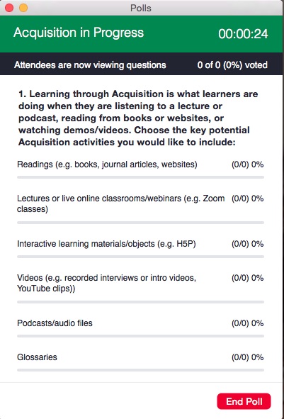 The early part of the workshop saw participants working quietly alone, to make notes on the learning types. Participants were then placed into breakout rooms to discuss only some of the learning types before coming back to the main room. We felt the division of learning types for the breakout activity might have placed a constraint on the discussion. Similarly, only one spokesperson from each breakout room was invited to populate the Google document, which might have left others feeling left out or unable to contribute as they would like. We therefore wanted to figure out a way to maximise participation and began to think about how the use of polls might encourage everyone to input in a time-efficient and democratic way.
