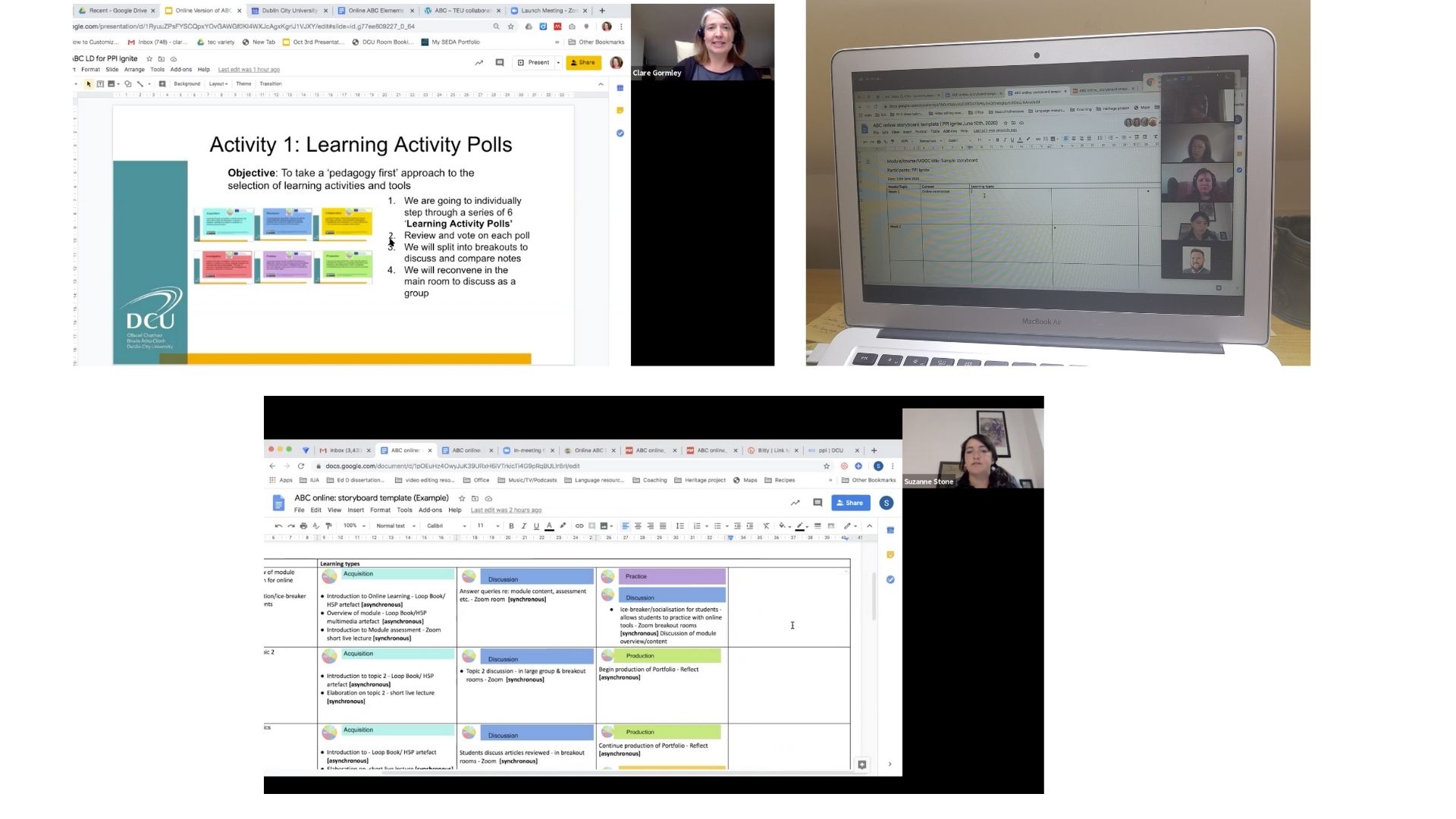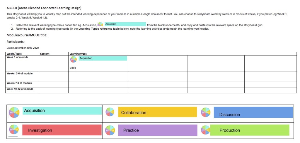 Participants are next shown a video explaining what storyboarding is and how to go about storyboarding a module using the language and tools of ABC LD. There is time to discuss the storyboarding process and then a storyboard template in the form of a shared Google document is circulated via the chat. Participants are invited to remain online and commence storyboarding while the facilitators depart or the team can decide to storyboard at another time themselves.