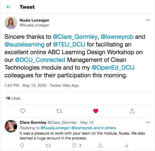ABC has become a core learning design framework at DCU for the design of new programmes and for those changing to a fully online or more hybrid and/or blended format. Future plans will address feedback raised by workshop participants. Very importantly, since we recognise that immediate feedback is only part of the evaluation picture, we will go back to participants in six months time (and beyond) to learn more about the outcomes of the workshop. This way we hope to find out what specific changes occurred in practice so we can continue to enhance the format and our knowledge of how best to apply it. If you would like to hear more about our experience of implementing ABC to learning design, then please don’t hesitate to contact us.