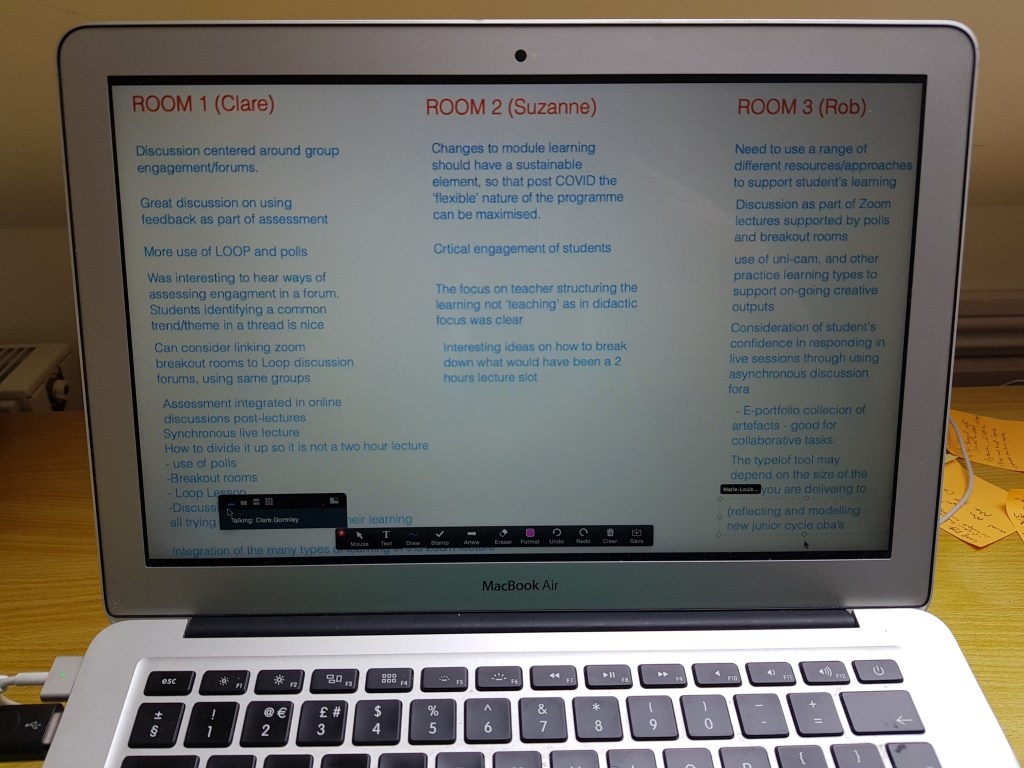 Upon returning to the main room, participants are asked to annotate a Zoom whiteboard and add the main points of discussion and prevailing learning activities discussed in the breakout room. As the whiteboard grows, commonalities between the breakout rooms become evident and the most appropriate learning activities are identified. The whiteboard is saved and shared afterwards as a reference resource.