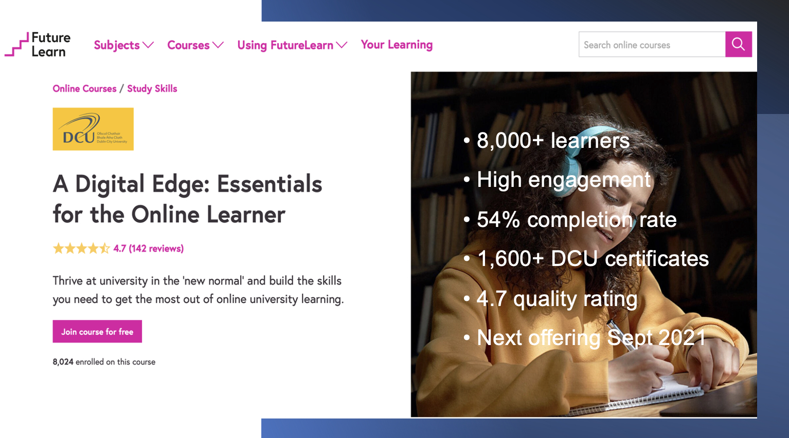 As part of the DigiTeL Pro launch event, we also provided a brief update on DCU’s free course, A Digital Edge: Essentials for the Online Learner, offered through FutureLearn. This course, co-facilitated by students and originally supported by IUA and the DCU Students’ Union, has so far attracted over 10,000 students worldwide with a completion rate of over 50%. Over 2,000 DCU students have claimed full certificates of completion. The course was a direct response to the COVID crisis and focuses on developing student readiness for online learning. It completes the suite of offerings supported by DigiTeL Pro.