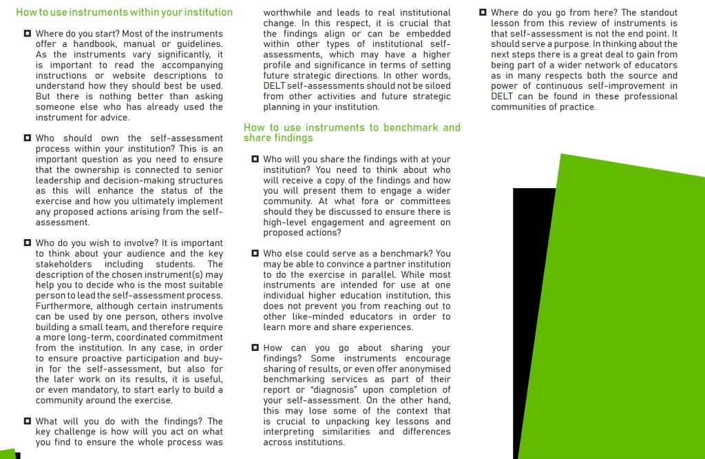 The outcome of this work is a report published by the European Universities Association (EUA) that should be of particular interest to higher education institutions, but also to policy makers and quality assurance agencies. Advice and guidance is provided for higher education institutions on how to select the right instruments, use them as part of self-assessment, and share and act on the findings. To begin with the review was framed by the following research question: