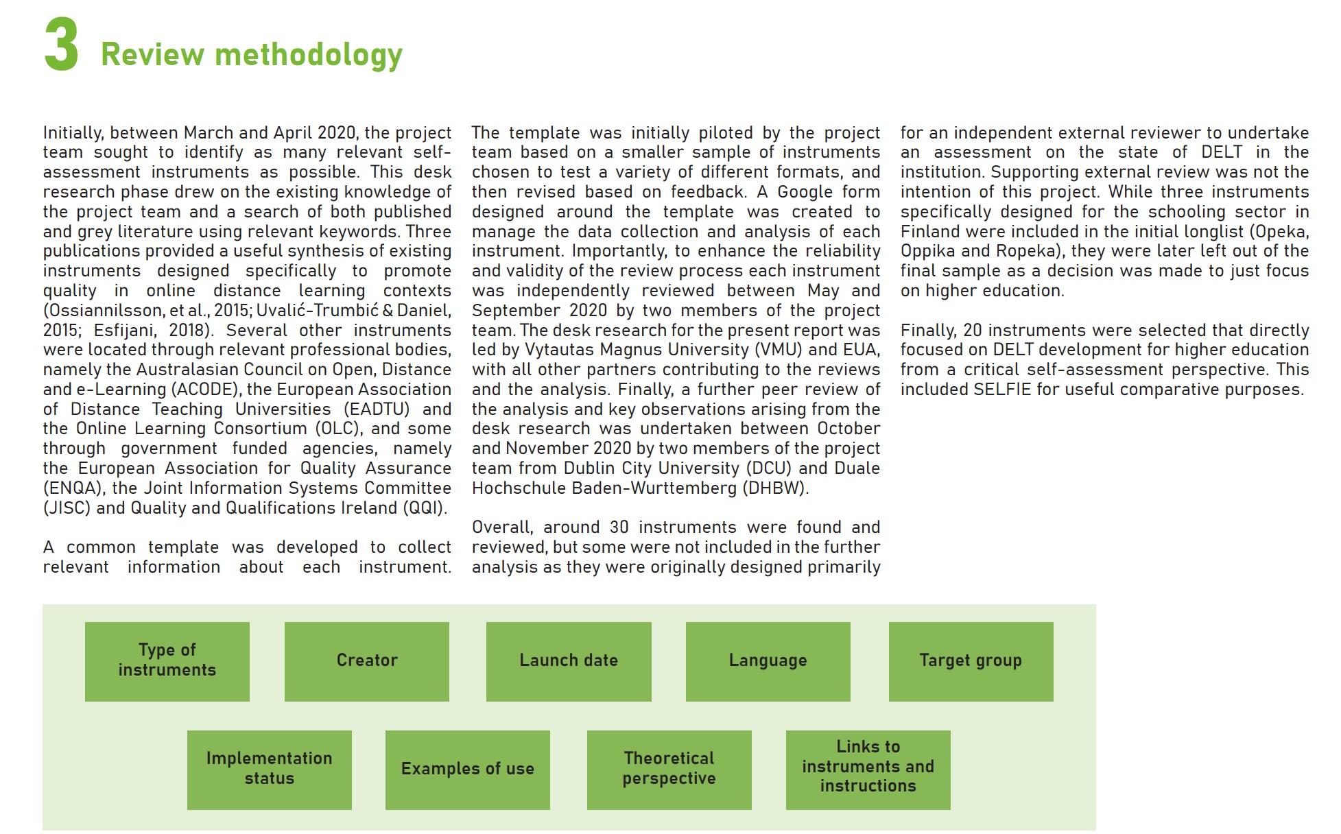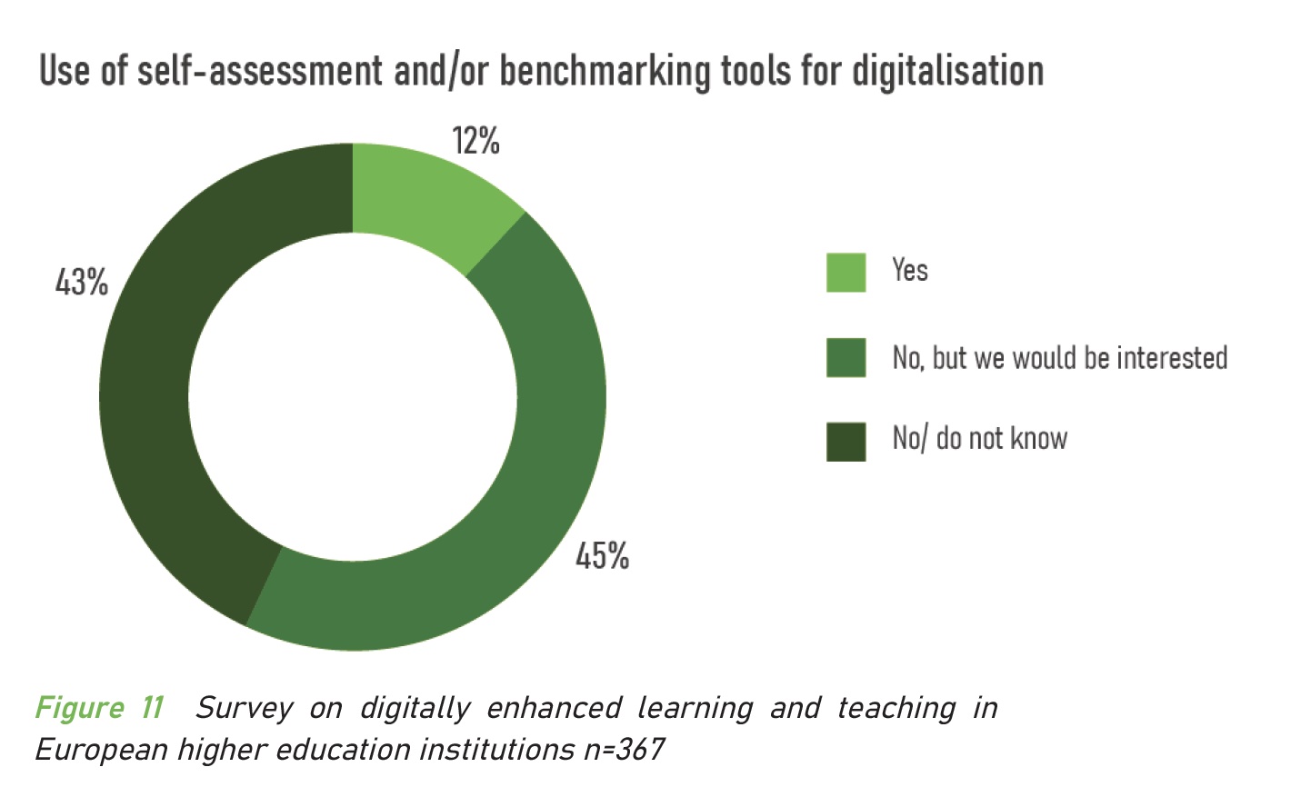 Current evidence suggests use of self-assessment and/or benchmarking instruments for digital education capacity development is not particularly common in Europe, as illustrated above in the findings of a related survey of digital learning and teaching in European higher education institutions (EUA, 2021). This survey along with the review of self-assessment instruments is part of the Digi-HE project co-funded by the Erasmus+ Programme of the European Union.