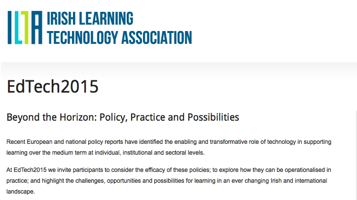 At the end of May over 200 Irish educators gathered at the University of Limerick for this year’s Irish Learning Technology Association (ILTA) Conference – EdTech 2015. It was pleasing to see so many people at the conference as current efforts to build digital capacity, promote institutional collaboration, and support new models of teaching and learning, depends to a large extent on the health, vibrancy and level of activity of our professional bodies. While it is important for us to contribute to major European and international communities in the field this should not be at the expense of supporting local, grass-root, professional learning opportunities.